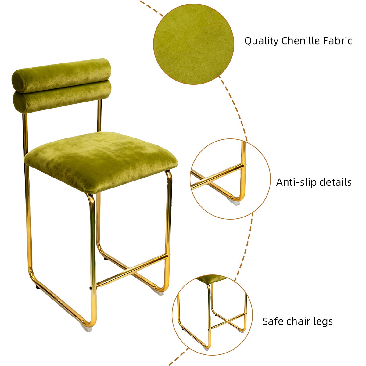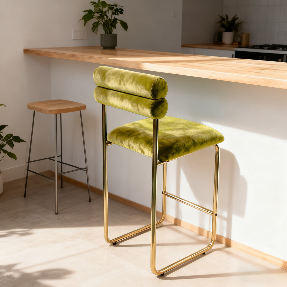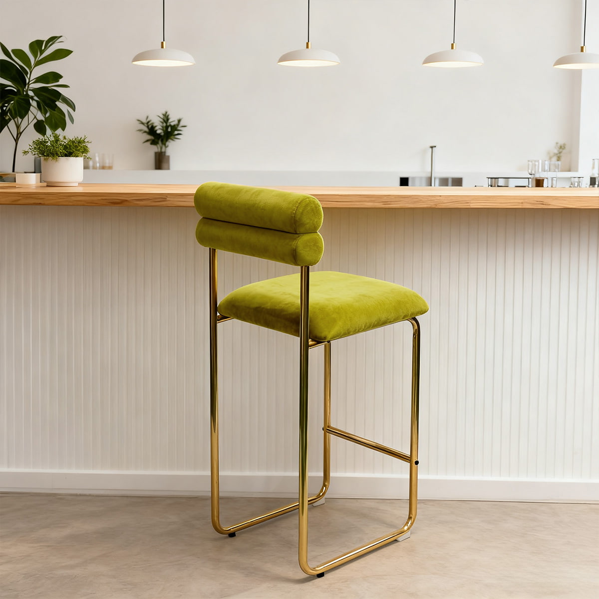 Nowoczesny stołek barowy z zielonym aksamitem, ze złotą metalową ramą i podnóżkiem — minimalistyczne krzesło tapicerowane do wyspy kuchennej, jadalni, kawiarni lub recepcji