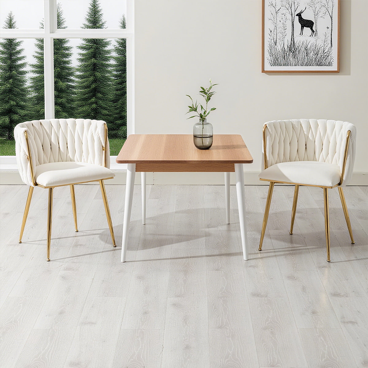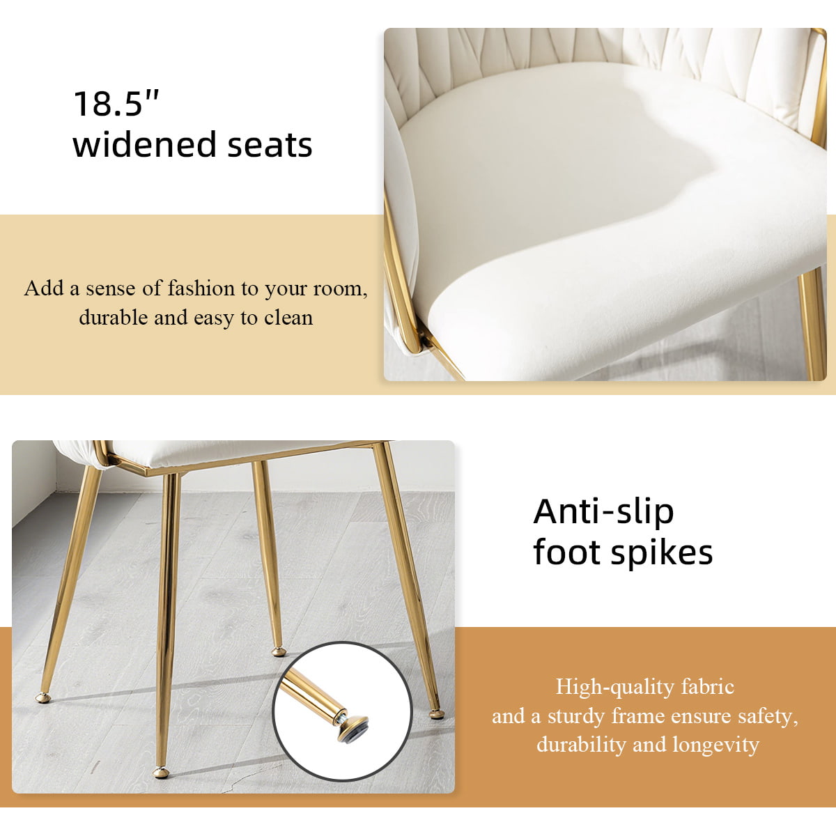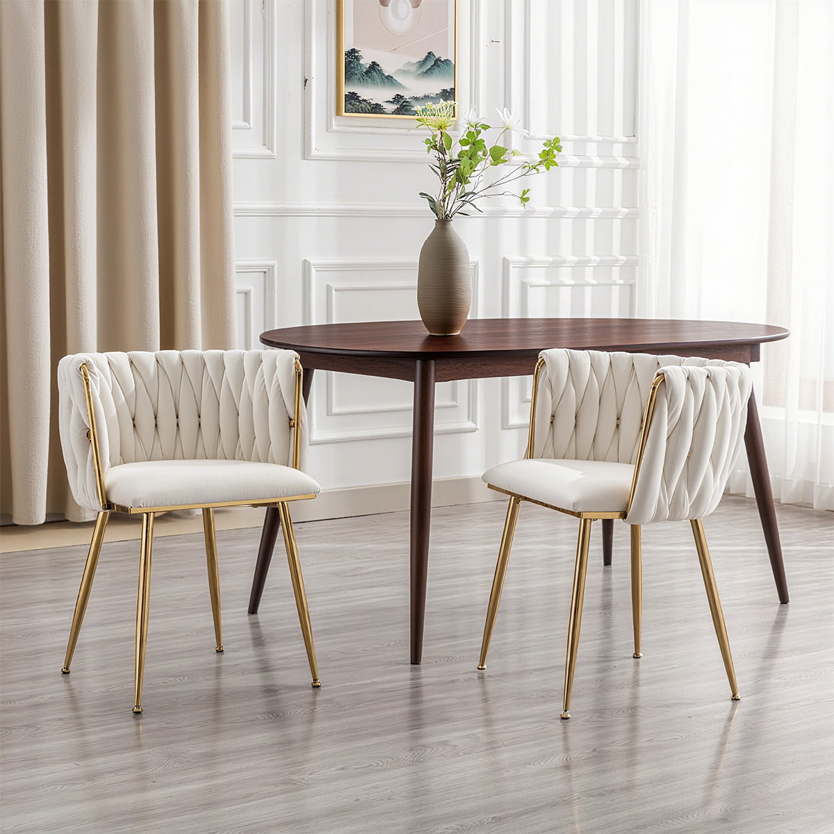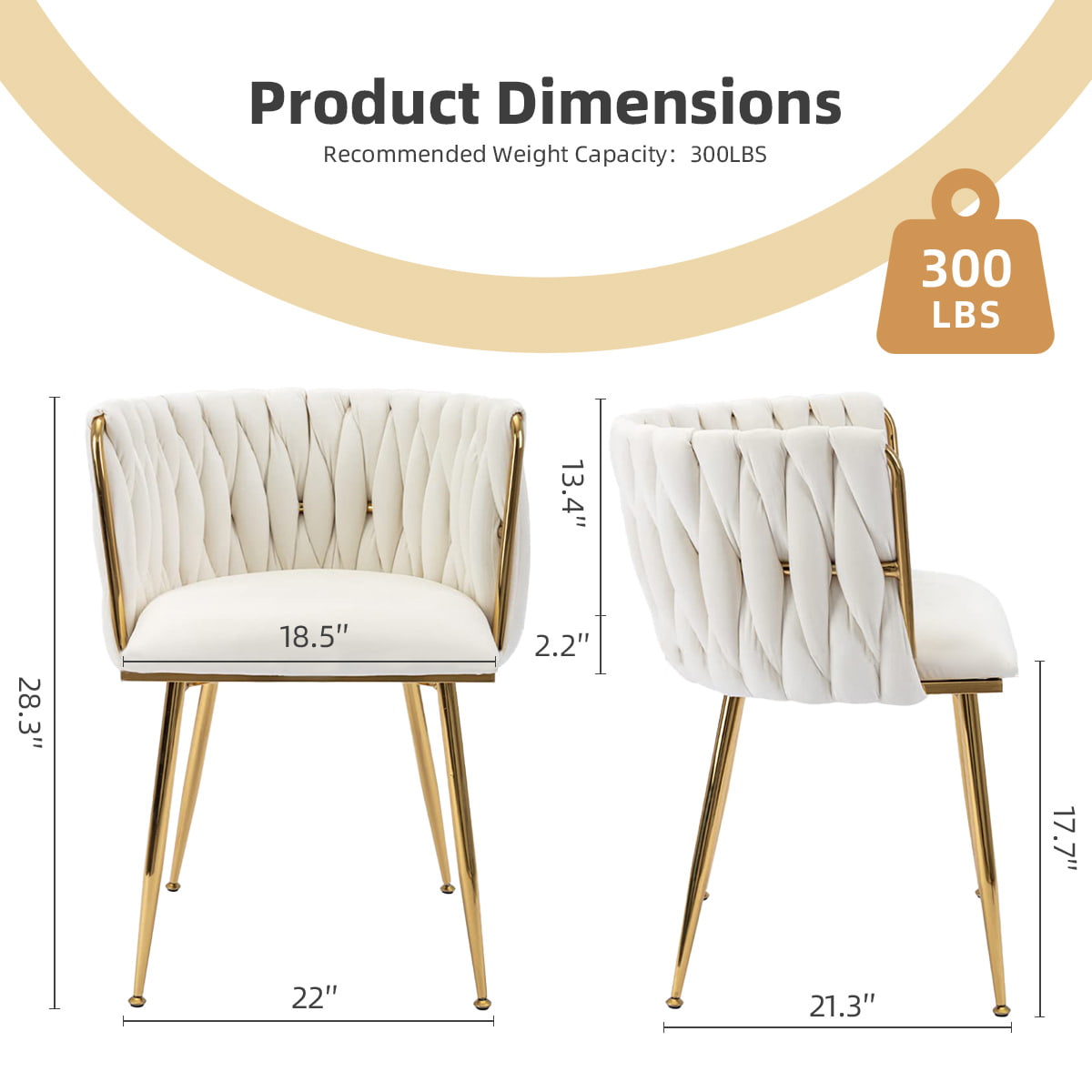 To krzesło do jadalni tapicerowane aksamitem w kolorze kości słoniowej z tkanym oparciem to wszechstronne, nowoczesne krzesło akcentujące, stołek toaletkowy i krzesło boczne z połowy stulecia. Wyposażony w luksusowy aksamitny materiał, złote metalowe nogi, ergonomiczne oparcie i poduszki z pianki o dużej gęstości, został zaprojektowany z myślą o wygodzie i stylu. Idealny do jadalni, salonów, sypialni, toaletek, biur, kawiarni i hoteli, spełnia potrzeby zarówno użytkowników domowych, jak i nabywców komercyjnych.