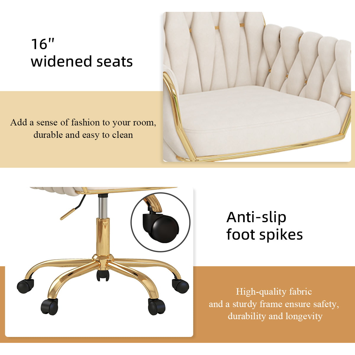 Krzesło do domowego biura w kolorze beżowym aksamitu – nowoczesne, regulowane krzesło toaletkowe ze złotą podstawą, ręcznie tkanym oparciem i podłokietnikiem, obrotowe krzesło biurowe na kółkach 360°