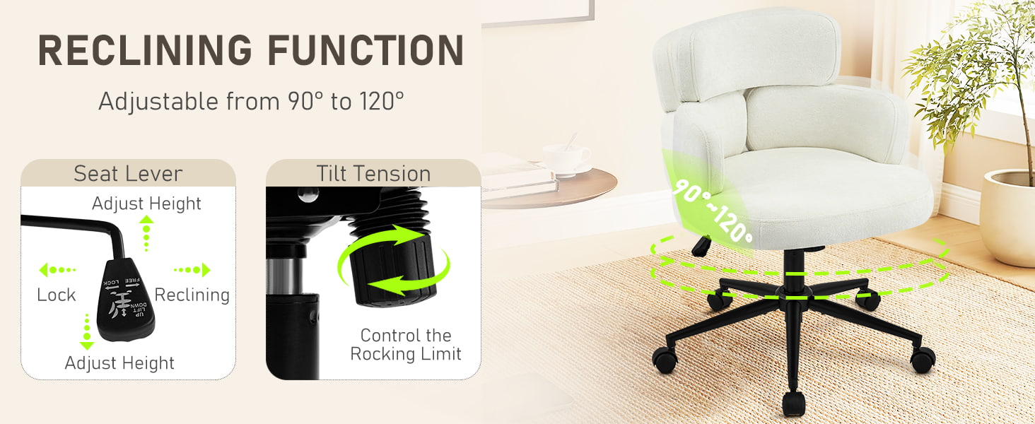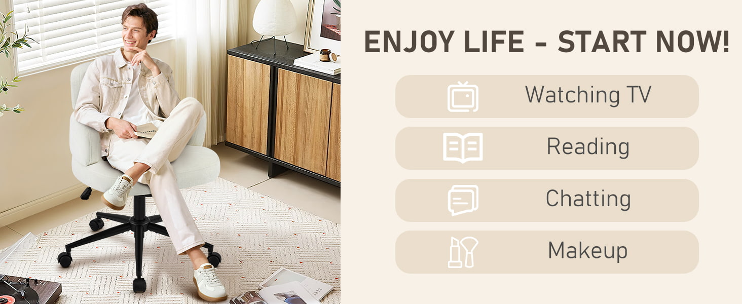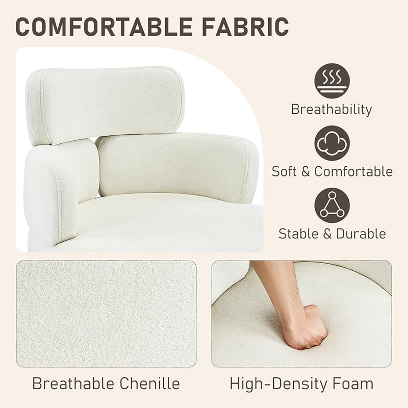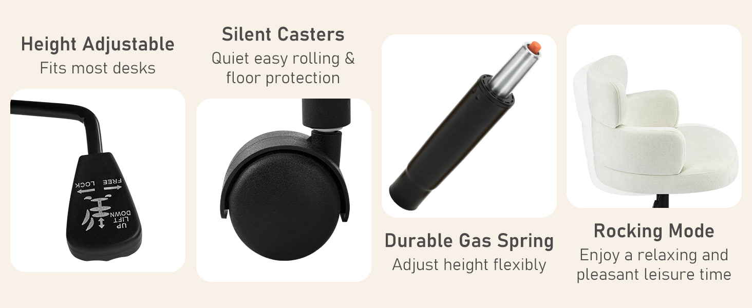Otulone oddychającą tkaniną szenilową i wsparte grubą piankową poduszką, krzesło zapewnia długotrwały komfort pracy, czytania i relaksu. Regulowana wysokość siedziska, płynny obrót o 360° i funkcja delikatnego bujania umożliwiają użytkownikom łatwe dostosowanie pozycji siedzącej. Solidna metalowa podstawa z cichymi kółkami zapewnia stabilność, mobilność i ochronę podłogi, dzięki czemu jest to praktyczne i eleganckie rozwiązanie do siedzenia dla współczesnego życia.