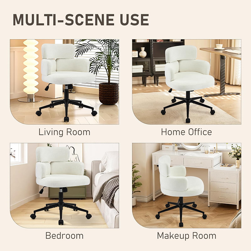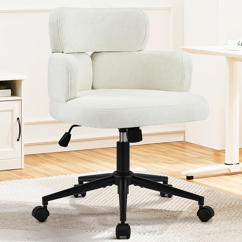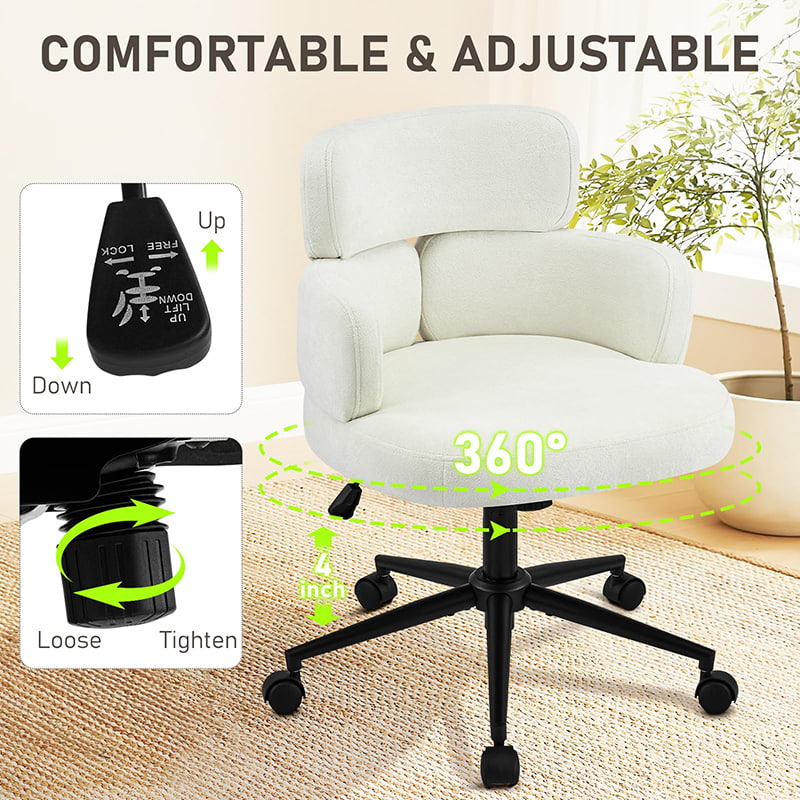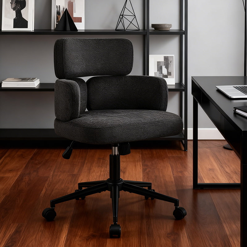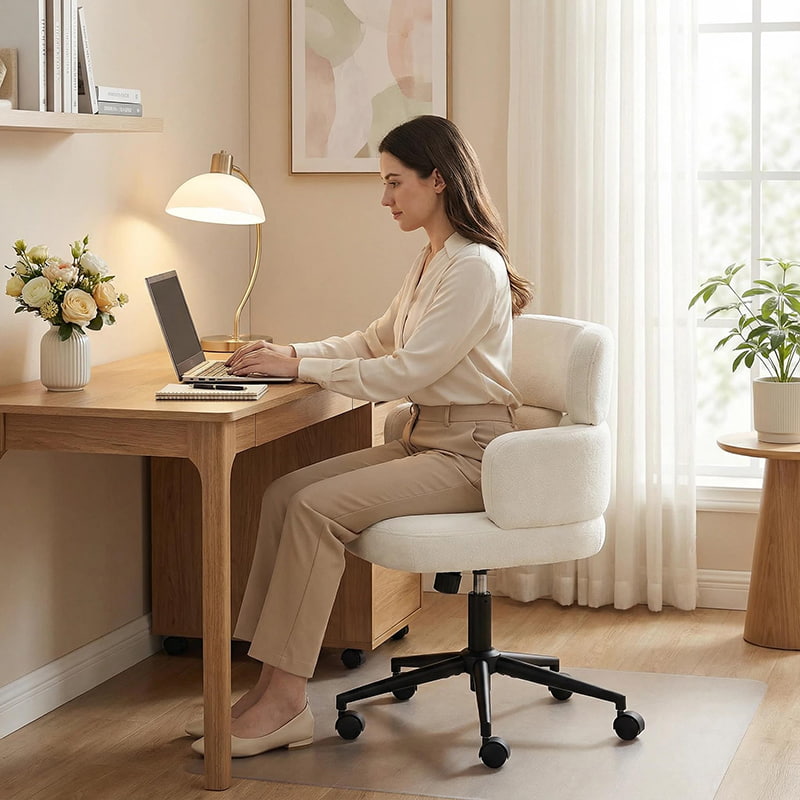 To tapicerowane obrotowe krzesło biurowe jest przeznaczone do nowoczesnych biur domowych, butikowych przestrzeni do pracy i wnętrz zorientowanych na styl życia. Krzesło to, wyposażone w charakterystyczne oparcie w kształcie koniczyny ze zintegrowanym podłokietnikiem, łączy w sobie atrakcyjność wizualną z funkcjonalną ergonomią. Szerokie, miękko wyściełane siedzisko obite przyjazną dla skóry tkaniną szenilową zapewnia miękkie i wygodne siedzenie podczas długich godzin pracy, czytania lub relaksu. Mechanizm regulacji wysokości, płynny obrót o 360 stopni i funkcja delikatnego bujania pozwalają użytkownikom z łatwością dostosować pozycję siedzącą, a solidna metalowa podstawa i ciche kółka zapewniają stabilność, mobilność i ochronę podłogi w różnych środowiskach.