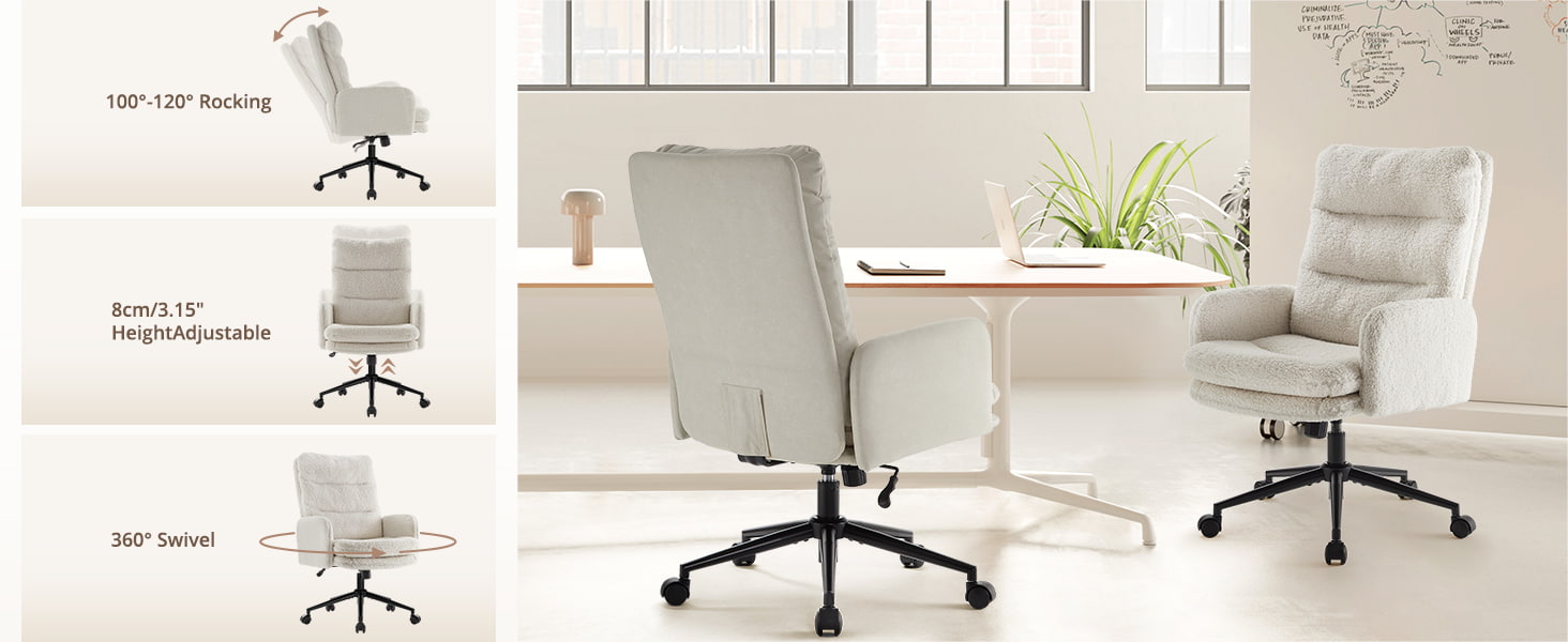 To krzesło biurowe z kaszmiru z wysokim oparciem zostało zaprojektowane z myślą o nabywcach ceniących wygodę na najwyższym poziomie, nowoczesną estetykę i ergonomiczne wsparcie. Wyposażone w dwuwarstwowe wyściełane siedzisko z bawełny figurowej i gąbki o dużej gęstości, krzesło zapewnia miękkość przypominającą chmurę, zachowując jednocześnie stabilne podparcie podczas długich sesji siedzących. Miękka tkanina ze sztucznego kaszmiru zapewnia ciepły, przyjazny dla skóry dotyk, dzięki czemu idealnie nadaje się do domowych biur, sypialni, toaletek i współczesnych miejsc do pracy. Obrotowa podstawa 360°, podnośnik z certyfikatem SGS, ciche kółka i funkcja kołysania w zakresie 100°–120° sprawiają, że nadaje się do produktywności, relaksu i codziennego użytku.