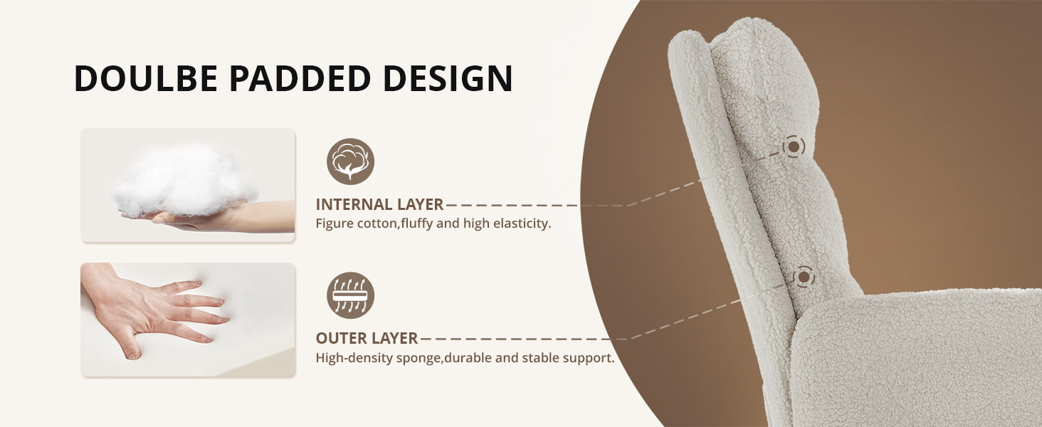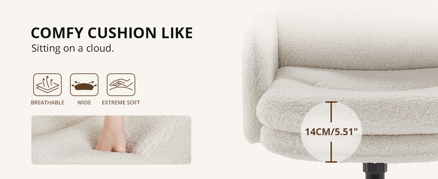 Dwuwarstwowa poduszka — zawierająca puszystą bawełnę i gąbkę o dużej gęstości — zapewnia uczucie siedzenia przypominające chmurę, które pozostaje wygodne nawet podczas długich sesji pracy lub nauki. Krzesło posiada funkcję bujania w zakresie 100°–120°, siedzisko z regulacją wysokości 8 cm i obrót o 360°, co zapewnia pełną elastyczność przez cały dzień.